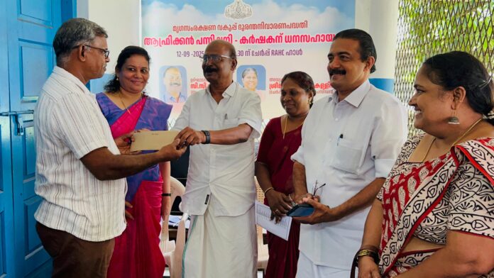 ചേര്പ്പ് ഗ്രാമപഞ്ചായത്തില് ആഫ്രിക്കന് പന്നിപ്പനി ബാധിച്ച് ചത്ത പന്നികളുടെ ഉടമസ്ഥനായ രാജീവ് തട്ടാരത്തിലിനുള്ള നഷ്ടപരിഹാര തുകയായ 8,73,500 രൂപയുടെ ചെക്ക് സി.സി. മുകുന്ദന് എം.എല്.എ. കൈമാറി. ചേര്പ്പ് വെറ്ററിനറി ഹോസ്പിറ്റലില് നടന്ന ചടങ്ങില് ഗ്രാമപഞ്ചായത്ത് പ്രസിഡന്റ് സുജിഷ കള്ളിയത്ത് അധ്യക്ഷത വഹിച്ചു. 2022 സെപ്തംബര്, ഒക്ടോബര് മാസങ്ങളിലായി ആഫ്രിക്കന് പന്നിപ്പനി ബാധിച്ച് രാജീവ് തട്ടാരത്തിലിന്റെ 107 പന്നികള് ചത്തിരുന്നു. നഷ്ടപരിഹാരമായി മൃഗസംരക്ഷണ വകുപ്പ് ദുരന്തനിവാരണ പദ്ധതിയില് ഉള്പ്പെടുത്തിയാണ് തുക നല്കിയത്.